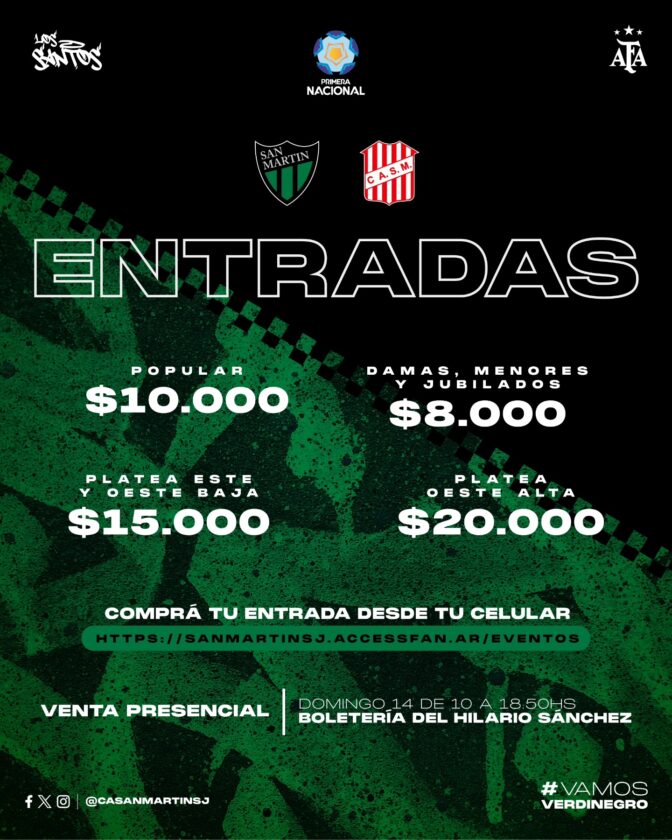 La venta de entradas presencial comienza el día domingo desde las 10:00hs en el Hilario Sánchez. Ya se encuentra habilitada la venta online a través de la app y del sitio http://sanmartinsj.accessfan.ar/eventos