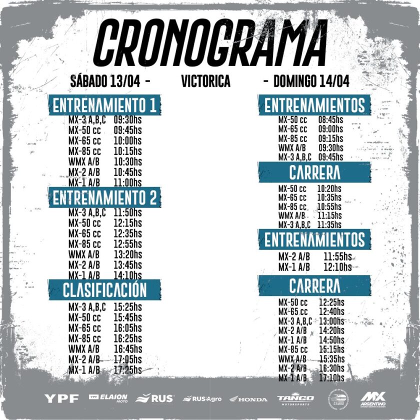 El fin de semana se correrá la primera fecha del Campeonato argentino de motocross en Victorica, provincia de La Pampa, en el circuito Los Caldenes MX. Inicia el calendario para uno de las disciplinas más importantes y tradicionales del deporte motor en dos ruedas, como siempre con buena presencia de pilotos sanjuaninos. Cinco son los que estarán presentes: Delfina Rodríguez, Catalina Rodríguez, Pedro Gil, Ricardo Mira y Alejandro Telles.