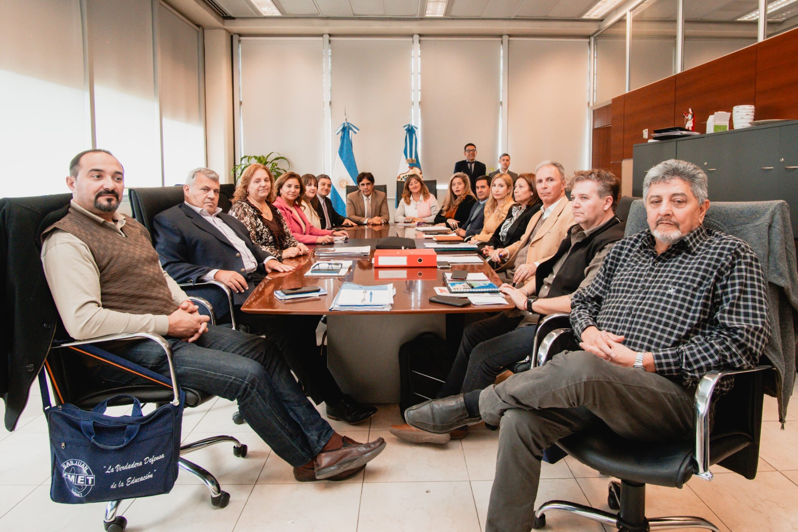 Estuvieron presentes los secretarios generales de los gremios docentes: Patricia Quiroga, de UDAP; Karina Navarro, de UDA; y Daniel Quiroga, de AMET.