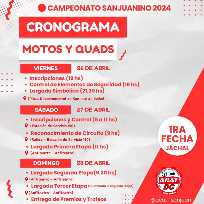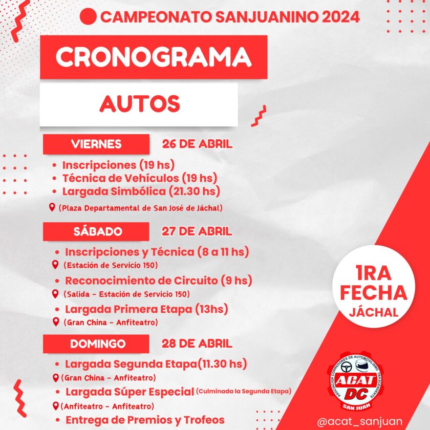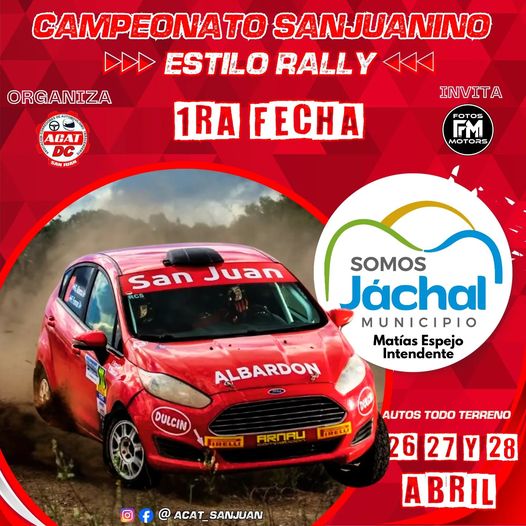 Este fin de semana arranca el campeonato sanjuanino de autos estilo Rally en el departamento Jáchal, organizado por ACAT y fiscalizado por la Federación Sanjuanina de Automovilismo Deportivo. La competencia tiene prevista rampa simbólica para la jornada de hoy viernes, dos etapas entre sábado y domingo y un súper especial que cerrará la carrera en el Anfiteatro.