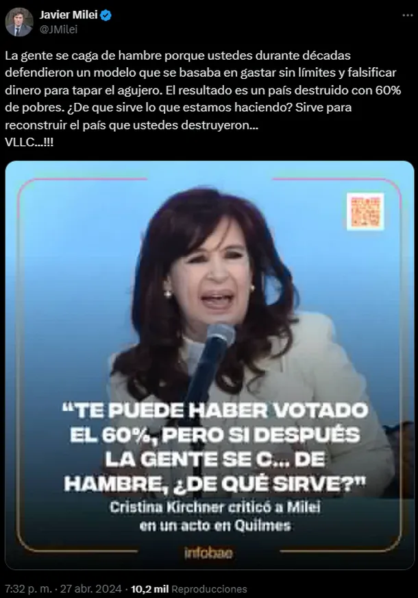 Minutos más tarde, a través de su cuenta en X (ExTwitter), el Presidente recogió el guante y contestó: “La gente se caga de hambre porque ustedes durante décadas defendieron un modelo que se basaba en gastar sin límites y falsificar dinero para tapar el agujero”.