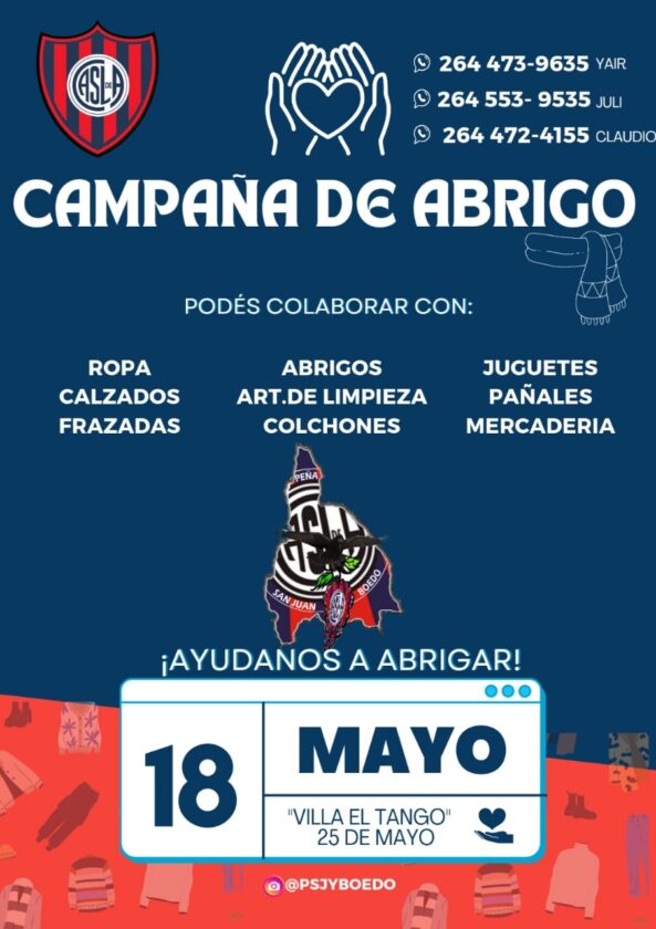 Una noble iniciativa destinada a brindar ayuda a quienes se encuentran en situación de vulnerabilidad durante los meses más fríos. Con el espíritu de colaboración que los caracteriza, se invita a sumarse a esta causa. Con la donación, en buen estado, de ropa de abrigo, calzado, mantas, pañales, juguetes y alimentos no perecederos son solo algunas de las maneras en las que puede contribuir. En caso de no tener donaciones y querer colaborar con la causa puedes enviar dinero a este alias: San Juan y Boedo (perteneciente a la peña) y nosotros compraremos lo que haga falta.