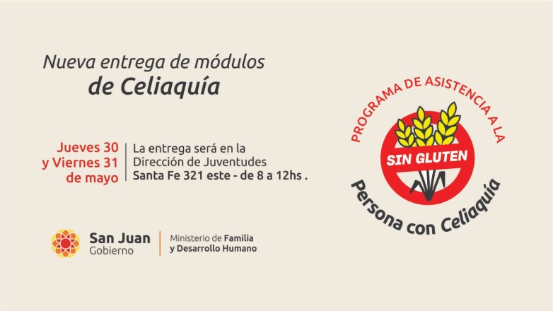 El Gobierno de San Juan, a través de la Dirección de Emergencia y Políticas Alimentarias dependiente del Ministerio de Familia y Desarrollo Humano, llevará adelante una nueva entrega de módulos alimentarios para celíacos.