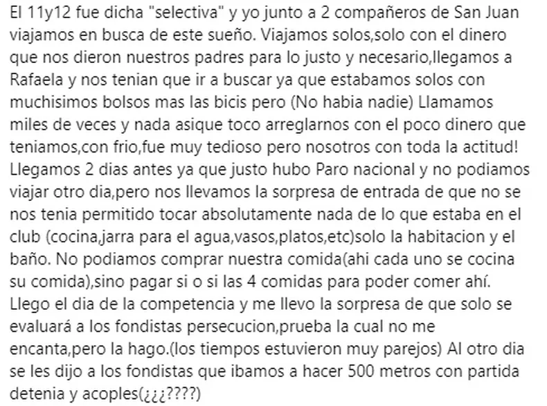 «El enojo y decepción fue grande ya que pasamos tanto para poder estar presentes en las selectivas y ellos ya tenían su lista de ciclistas ya seleccionados. Me sorprende y me decepciona saber que gente a la que idolatré por muchos años, como Walter Perez, quien estuvo y está al frente de esto, sea quien también es parte de que hoy muchos ciclistas no puedan alcanzar su sueño dorado, ya que el sueño esta arreglado y acomodado. Qué injusto», expresó Medrano.
