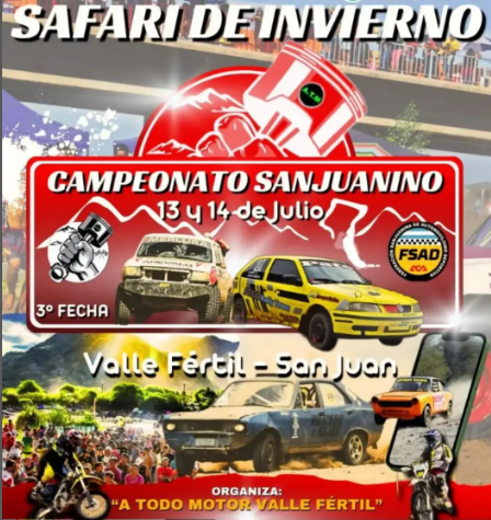No será el tradicional Safari tras las sierras de todos los veranos vallistas, si una fecha del torneo local, con mucha similitud a lo que se vive, pero con variantes propias de la competencia. Lo cierto es que durante las vacaciones de invierno los amantes de los motores y de las competencias podrán disfrutar de la 3ª Fecha del Campeonato Sanjuanino modalidad Rally 4 prime en Valle Fértil.