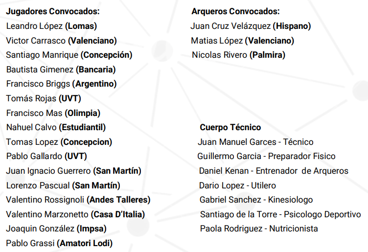 El CNTHsP da a conocer la lista de convocados por el técnico de la Selección Argentina Sub 19, Juan Manuel Garcés, para los entrenamientos que se llevarán a cabo en la provincia de San Juan, como parte de la planificación programada para los WSG Italia 2024.