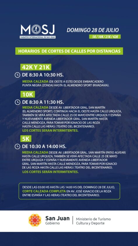 En cuanto a los circuitos, la distancia principal de 42K partirá desde el imponente dique Punta Negra desde las 8.30. Los competidores recorrerán la ruta provincial N° 12 y atravesando algunos de los paisajes más pintorescos de San Juan. Continuará por la emblemática avenida Libertador, desde el Jardín de los Poetas hasta calle Urquiza. El trayecto seguirá por calle 25 de Mayo, desde Urquiza hasta España, y retomará la avenida Libertador hasta calle Mendoza, para finalizar en Ignacio de la Roza y calle Las Heras.