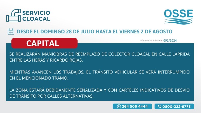 Obras Sanitarias programó maniobras de reemplazo de colector cloacal en calle Laprida entre Las Heras y Ricardo Rojas. Las tareas iniciarán este domingo 28 de julio y se prevé que se extiendan hasta el viernes 2 de agosto, viéndose interrumpido por completo la circulación del tránsito vehicular.