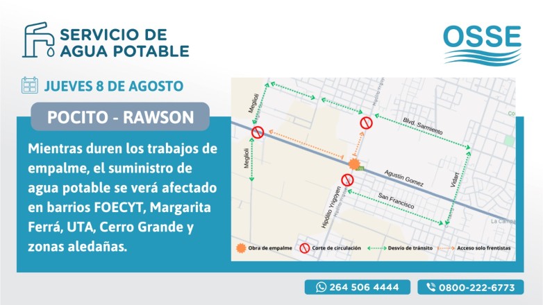 Obras Sanitarias informa que avanzará durante la jornada de este jueves 8 de agosto con un empalme que se realiza en el marco de una importante obra de refuerzo del servicio de agua potable que beneficiará a unos 40 mil habitantes de la zona suroeste de Rawson y noroeste de Pocito.