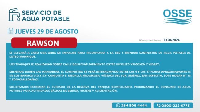 Obras Sanitarias informa que este jueves 29 de agosto, llevará a cabo una obra de empalme para incorporar a la red y brindar suministro de agua potable al Loteo Manrique en el Departamento de Rawson.