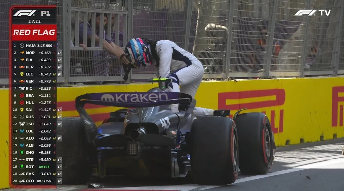 Colapinto estaba transitando un buen entrenamiento en su primera vez corriendo por el duro circuito callejero de Bakú. De hecho, antes del triste desenlace, había conseguido un gran tiempo que lo dejó 16°: 1.47.901, 54 milésimas mejor que Alex Albon, su compañero de Williams, y 2.355 segundos más tarde que Max Verstappen, el mejor de la práctica.