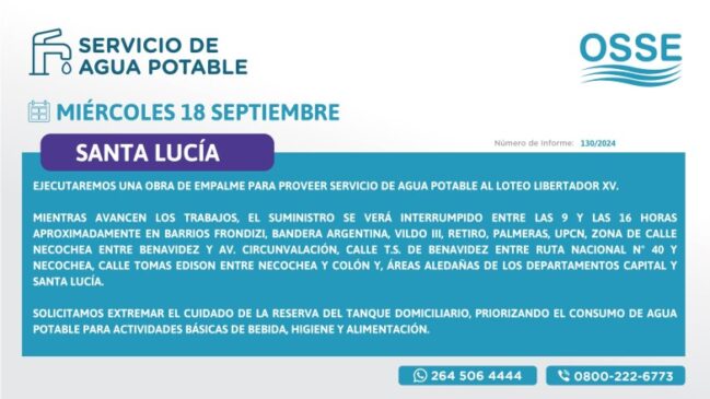 Mientras avancen los trabajos el suministro se verá interrumpido entre las 9 y las 16 horas, aproximadamente en barrios Frondizi, Bandera Argentina, Vildo III, Retiro, Palmeras, UPCN, zona de calle Necochea entre Benavidez y av. Circunvalación, calle T.S. de Benavidez entre Ruta Nacional N° 40 y Necochea, calle Tomas Edison entre Necochea y Colón y, áreas aledañas de los departamentos departamentos Capital y Santa Lucía.