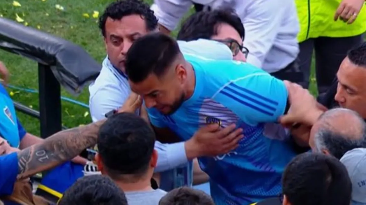 Según se pudo ver en la transmisión oficial, el arquero terminó colgado de la valla discutiendo con un plateista, pese a la intervención de sus compañeros.