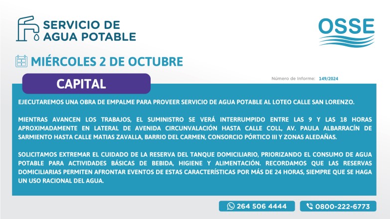 Obras Sanitarias informa que este miércoles 2 de octubre de 2024, llevará a cabo una obra de empalme para incorporar a la red y brindar suministro de agua potable al Loteo Calle San Lorenzo en el Departamento de Capital.
