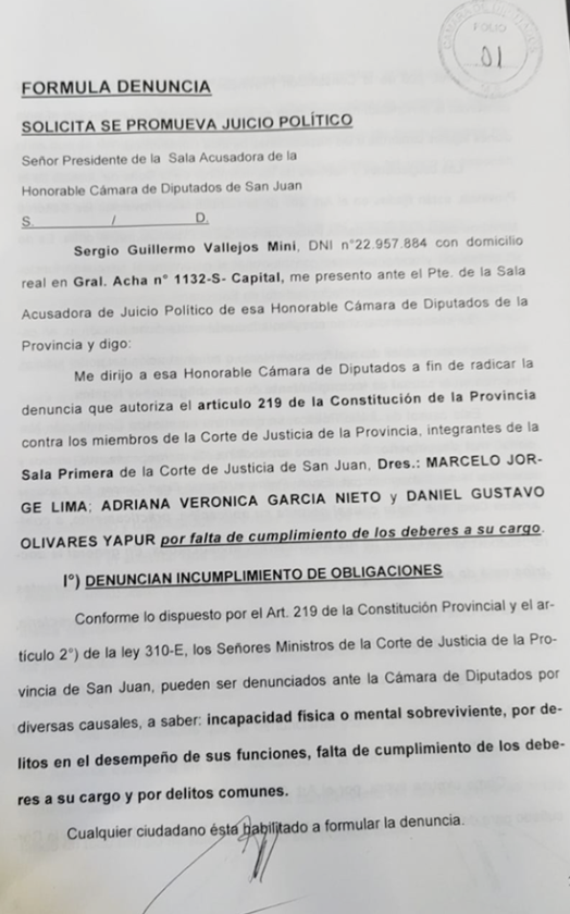 Vallejos ahora presentó un pedido de juicio político en la Legislatura de San Juan, pidiendo la destitución de los cortistas Marcelo Lima, Adriana García Nieto y Daniel Olivares Yapur, que son los que forman parte de la Sala Primera del máximo tribunal provincial.