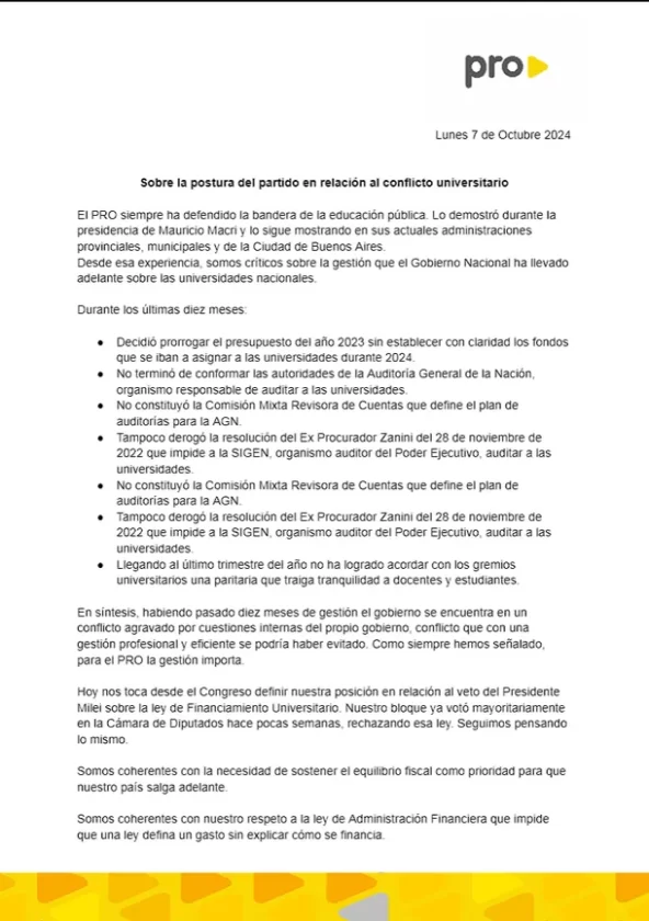 El PRO, encabezado por Mauricio Macri, decidió brindar su respaldo al veto presidencial de Javier Milei sobre la ley de aumento de financiamiento para las universidades nacionales. Este apoyo será crucial para el Gobierno en la Cámara de Diputados, ya que los votos podrían ser decisivos para bloquear cualquier intento de revocar la decisión del Ejecutivo.