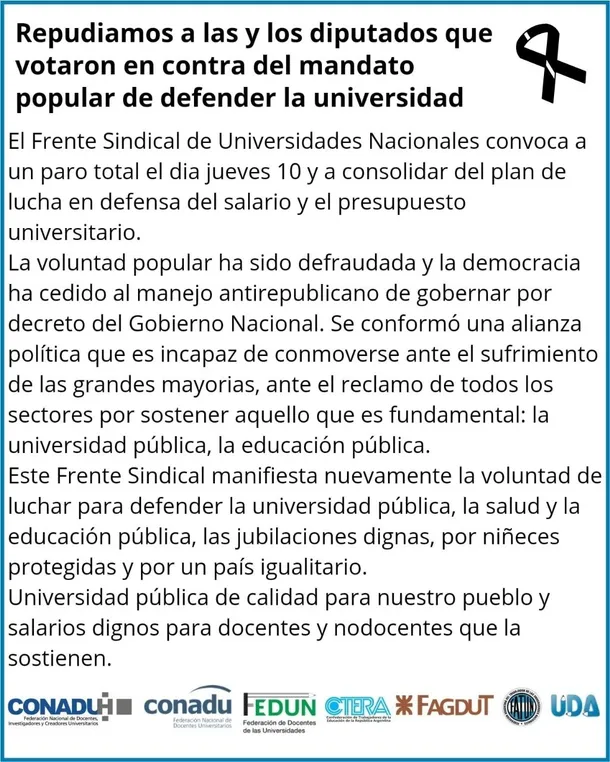 «Repudiamos a las y los diputados que votaron en contra del mandato popular de defender la universidad», titularon desde la organización integrada por la CONADU, FEDUN, CTRA, FAGDUT y UDA, entre otras entidades.