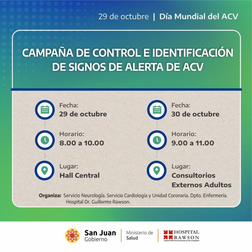 La campaña será este martes 29 de octubre de 8:00 a 11:00 hs en el Hall Central del Hospital Rawson y el miércoles 30 de octubre de 9:00 a 11:00 hs en los Consultorios Externos del Hospital Rawson. La actividad está organizada por el Servicio de Neurología, el Servicio de Cardiología y la Unidad Coronaria, junto al Departamento de Enfermería del hospital.