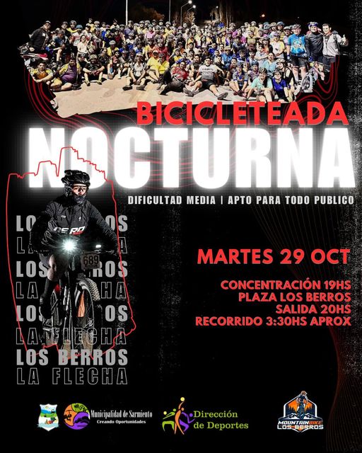 Los interesados podrán participar de manera gratuita. La concentración será en Los Berros y recorrerán la Quebrada de la Flecha. Todos los ciclistas de San Juan, que sean amantes de esta disciplina, tienen a su disposición una nueva experiencia para vivir y disfrutar. Se trata de la bicicleteada nocturna y gratuita que la Municipalidad de Sarmiento preparó para este martes 29 de octubre de 2024.