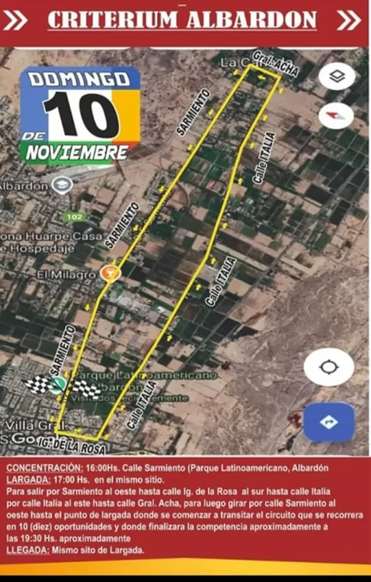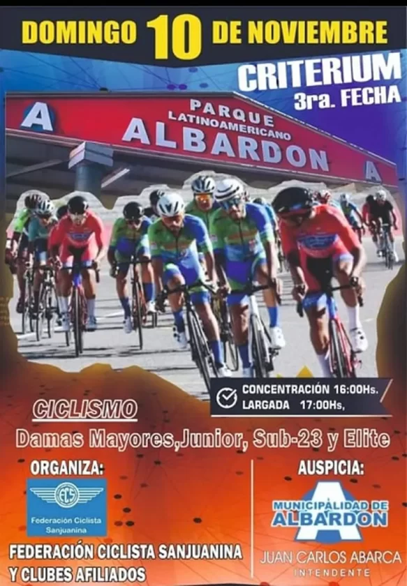 Según confirmaron desde la Federación Ciclista sanjuanina, la tercera fecha llevará el domingo 10 de noviembre bajo el nombre de «Criterium Albardón». Sí, en el departamento del Norte sanjuanino, se recorrerán 95 kilómetros en un circuito que comprende las calles principales de la comuna.