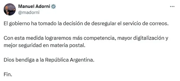 «El gobierno ha tomado la decisión de desregular el servicio de correos. Con esta medida lograremos más competencia, mayor digitalización y mejor seguridad en materia postal. Dios bendiga a la República Argentina. Fin.», escribió el funcionario, sin brindar mayores precisiones.