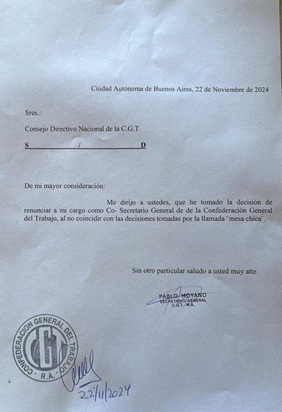 En este sentido, Moyano se mostró disgustado y no dudó en tomar la determinación de dar un paso al costado: «He tomado la decisión de renunciar a mi cargo de co-secretario general de la Confederación General del Trabajo, al no coincidir con las decisiones tomadas por la llamada ‘mesa chica'».