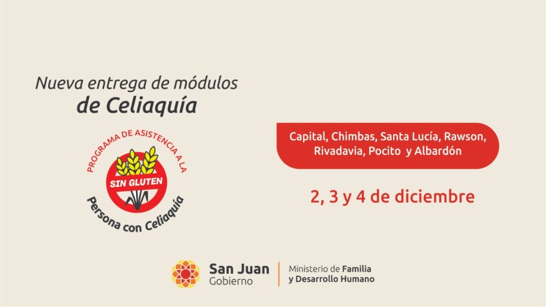 El Ministerio de Desarrollo Humano y Promoción Social informa a la comunidad del Gran San Juan que, en el marco del Programa de Alimentación para Personas Celíacas, se realizará la entrega de módulos alimentarios correspondientes a diciembre. La distribución de los mismos tendrá lugar los días 2, 3 y 4 de diciembre, en el horario de 8 a 12:30 horas.