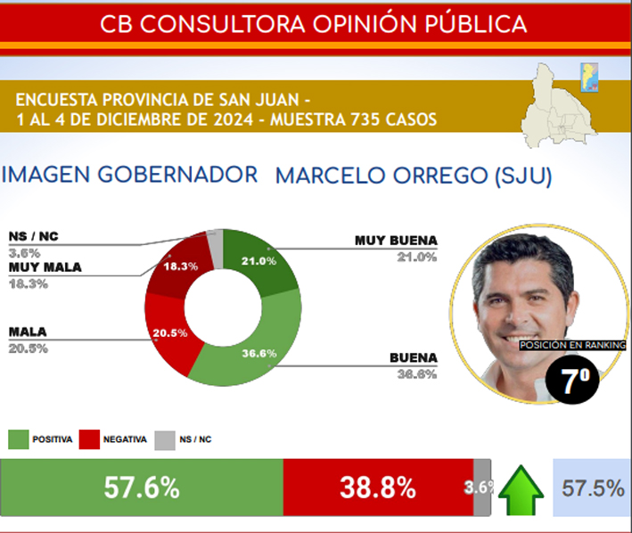 CB Consultora midió la imagen de todos los gobernadores del país. En el ranking de los que más positiva tienen, se encuentra el Gobernador de San Juan, Marcelo Orrego, quien quedó en el puesto número 7 entre los mejores conceptuados.