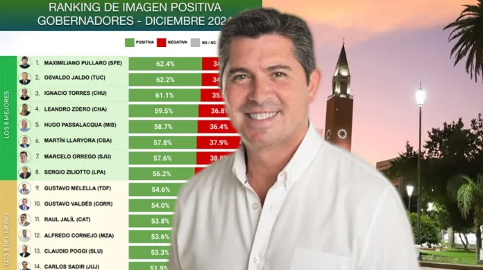 Los tres gobernadores mejor valorados de diciembre son: Maximiliano Pullaro, Santa Fe, con un 62,4% de aprobación. Le sigue Osvaldo Jaldo, de Tucumán, con una imagen positiva del 62,2%. En tercer lugar quedó Ignacio Torres, de Chubut, con 61,1%.