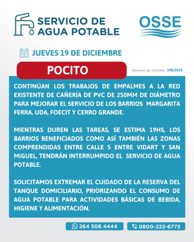 Mientras duren las tareas, se estima 19hs, los Barrios beneficiados como así también las zonas comprendidas entre Calle 5 entre Vidart y San Miguel, tendrán interrumpido el servicio de agua potable.