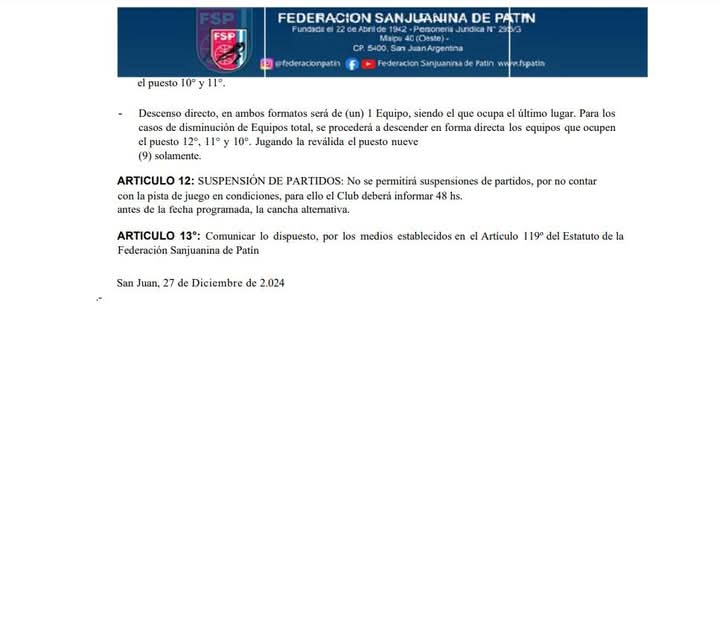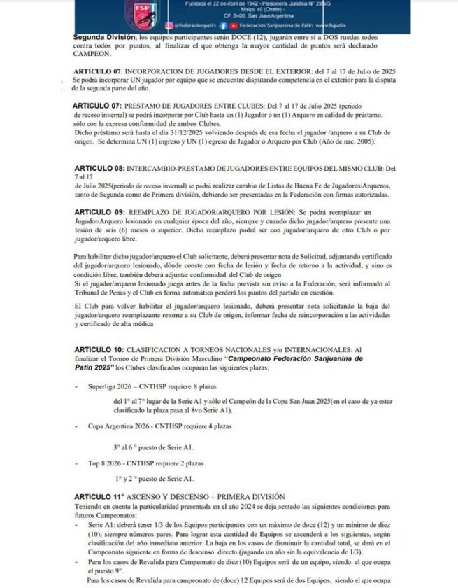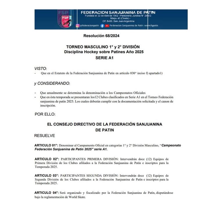 La federación Sanjuanina de Patín oficializó los campeonatos de primera y segunda división del 2025, que comenzarán a disputarse el próximo 28 de febrero.