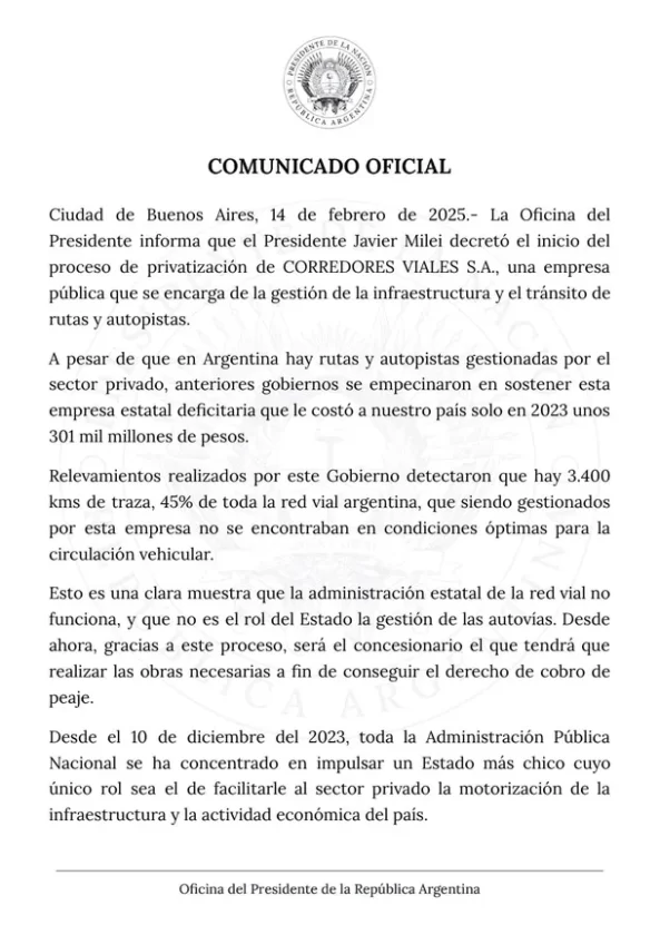 “El Gobierno Nacional tomó la decisión de privatizar la compañía Corredores Viales Sociedad Anónima bajo la modalidad de concesión de obra pública por peaje. A partir de este modelo se va a promover el desarrollo de obras de infraestructura a través de la participación del sector privado que se va a encargar de ejecutar las obras y gestiones necesarias a su propia cuenta y riesgo a cambio del derecho de exigir el cobro de un peaje a los usuarios”, anunció Adorni.