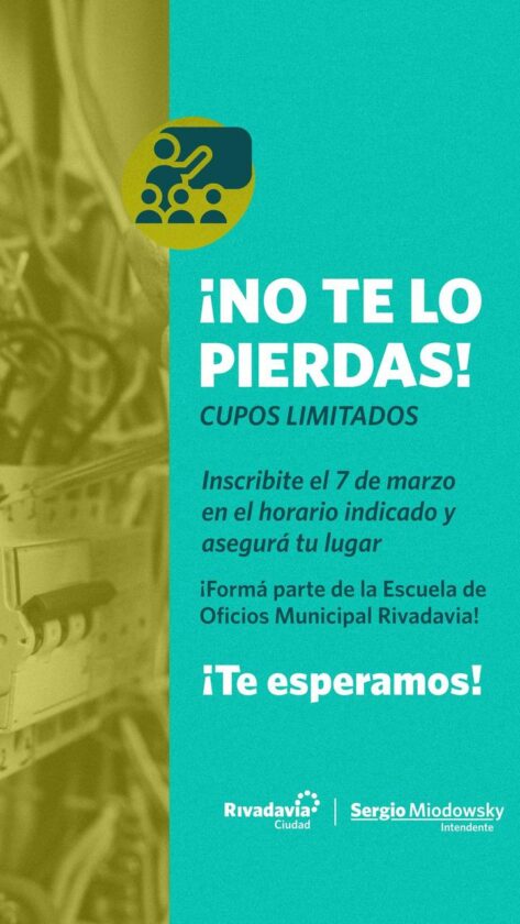El Municipio de Rivadavia, bajo la gestión de Sergio Miodowsky, invita a los vecinos a participar de las inscripciones para los cursos de la Escuela de Oficios Municipal, que se llevarán a cabo el próximo 7 de marzo, de 8:00 a 11:00 hs, en la sede ubicada en Av. Libertador General San Martín 5112 (O), esquina Santo Domingo.