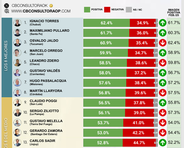 Los 4 gobernadores mejor valorados durante marzo de 2025 por los ciudadanos de cada provincia son: Ignacio Torres, de Chubut, con un 62,4% de aprobación. Le sigue Maximiliano Pullaro, de Santa Fe, con un 61,7%.