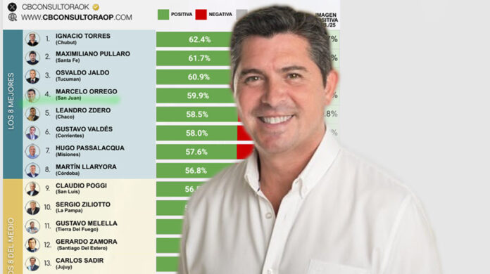 Según CB Consultora, que difundió una encuesta de ranking de gobernadores realizada en marzo de 2025, el Gobernador de San Juan, Marcelo Orrego, se ubicó en el cuarto lugar entre los mandatarios con mejor imagen de todo el país.