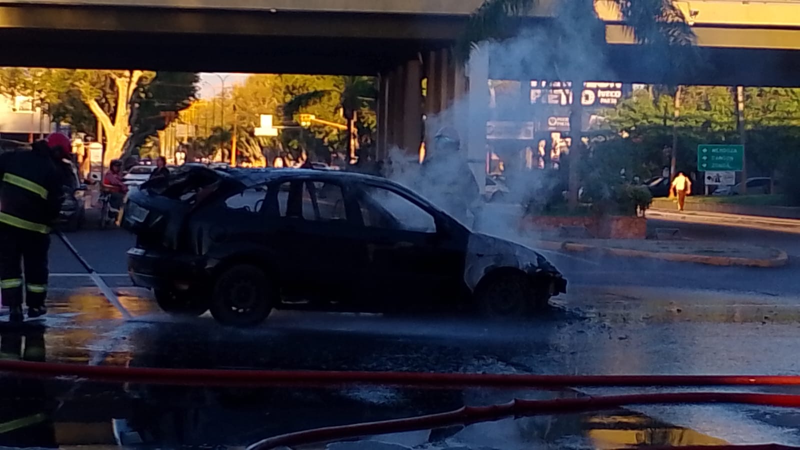 Este lunes, cerca de las 8, en intersección de Hipólito Yrigoyen y avenida Circunvalación, Santa Lucia, los que transitaban por este sector vivieron momentos de asombro al ver un vehículo, Ford Focus,incendiándose por completo.