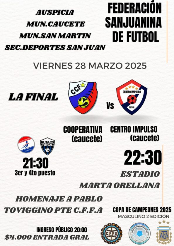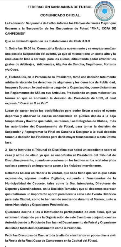 La federación sanjuanina de fútbol tras todo lo acontecido ayer en lo que fue la suspensión de la final entre cooperativa y centro impulso, además del encuentro por el tercer puesto, que fue poco claro, con más dudas que certezas, dónde las justificaciones dejaron mucho que desear, dando más lugar a las hipótesis que otra cosa.