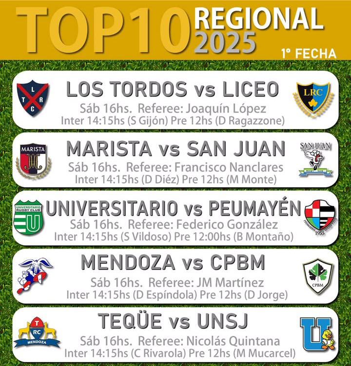 Los equipos del TOP 10 ORO deben jugar con Primera, Intermedia y Pre intermedia. (Reglamento General de Competencia 2025). Comienzo: 29/03/2025 Finaliza: 08/11/2025. (21 fechas).