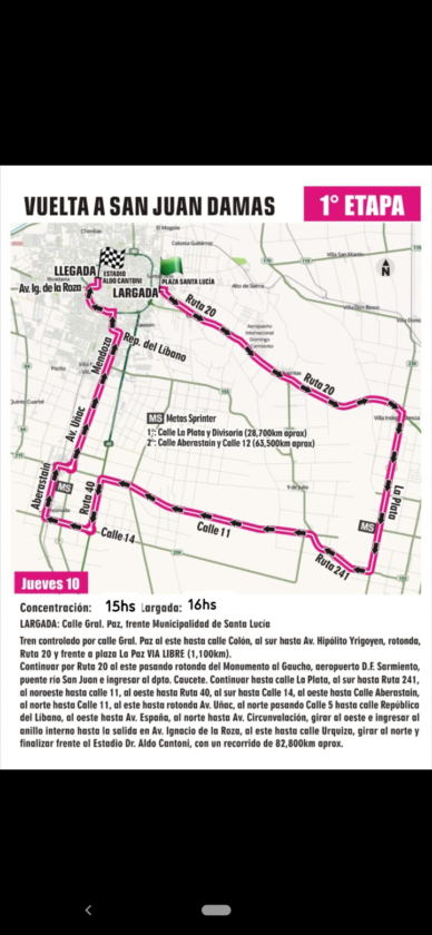 Continuar por Ruta 20 al este pasando rotonda del Monumento al Gaucho, aeropuerto D.F. Sarmiento, puente río San Juan e ingresar al dpto. Caucete. Continuar hasta calle La Plata, al sur hasta Ruta 241, al noroeste hasta calle 11, al oeste hasta Ruta 40, al sur hasta Calle 14, al oeste hasta Calle Aberastain, al norte hasta Calle 11, al este hasta rotonda Av. Uñac, al norte pasando Calle 5 hasta calle República del Líbano, al oeste hasta Av. España, al norte hasta Av. Circunvalación, girar al oeste e ingresar al anillo interno hasta la salida en Av. Ignacio de la Roza, al este hasta calle Urquiza, girar al norte y finalizar frente al Estadio Dr. Aldo Cantoni.