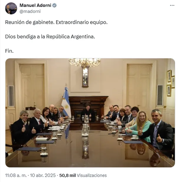 Manuel Adorni fue el encargado de compartir la primera foto del encuentro a través de la red social X (antes Twitter), acompañada por un mensaje breve pero cargado de intención: “Extraordinario equipo. Dios bendiga a la República Argentina. Fin”.