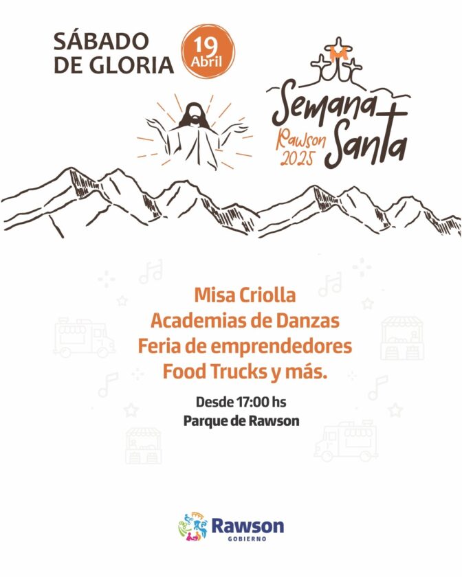 El día 19 de abril, Sábado de Gloria, a partir de las 17 en el Parque de Rawson se realizará la presentación de la Misa Criolla. Además, habrán espectáculos, feria de emprendedores y food trucks.