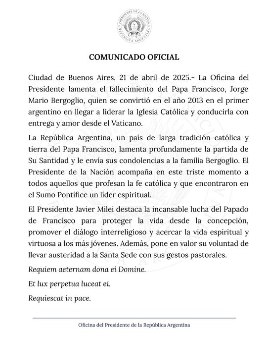 El Gobierno argentino emitió un comunicado por la muerte del papa Francisco, anunciada durante la madrugada de este lunes. “La Oficina del Presidente lamenta el fallecimiento del Papa Francisco, Jorge Mario Bergolio, quien se convirtió en el año 2013 en el primer argentino en llegar a liderar la Iglesia Católica y conducirla con entrega y amor desde el Vaticano”, expresaron.