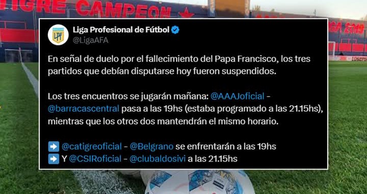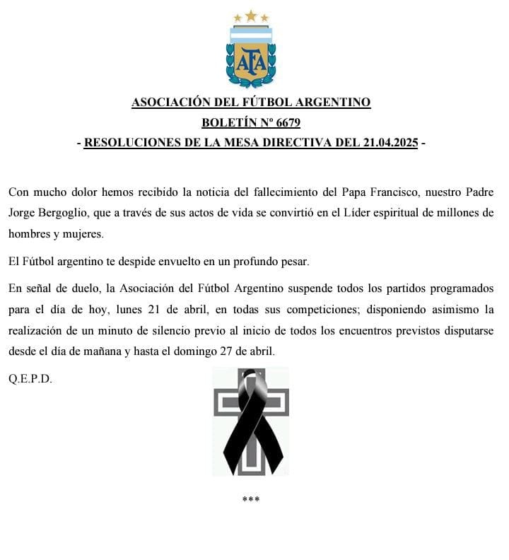 El mundo aún está sacudido por la muerte de Jorge Bergoglio, El Papa Francisco en esta madrugada, y el deporte no queda fuera de este shock que ocasionó la partida, a raíz de eso se confirmó la suspensión de los encuentros que se deberían disputar.