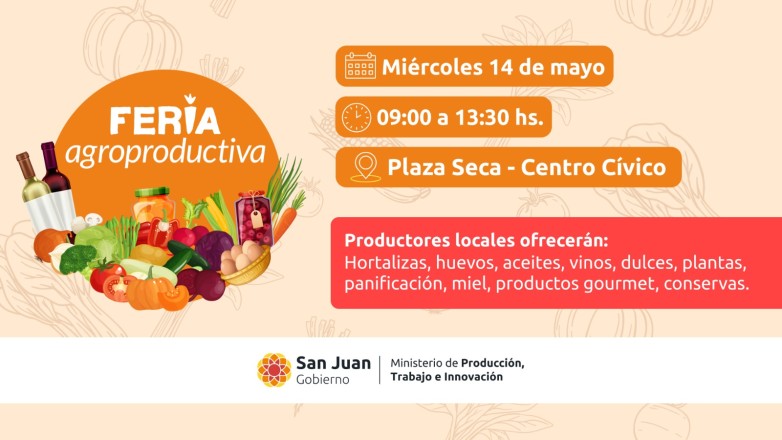 Vuelve La Feria más Importante del sector agroproductivo de San Juan. Organizada por la Secretaría de Agricultura, Ganadería y Agroindustria, la Feria Agroproductiva, arranca este miércoles 14 de mayo y los sanjuaninos podrán adquirir productos locales de calidad, en horario de 9 a 13.30, en la Plaza Seca del Centro Cívico.