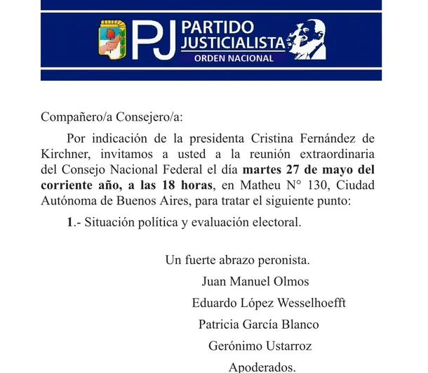 La expresidenta y titular del Partido Justicialista (PJ), Cristina Kirchner, convocó a una reunión extraordinaria de es espacio para este martes a las 18 con el objetivo de analizar el contexto electoral.