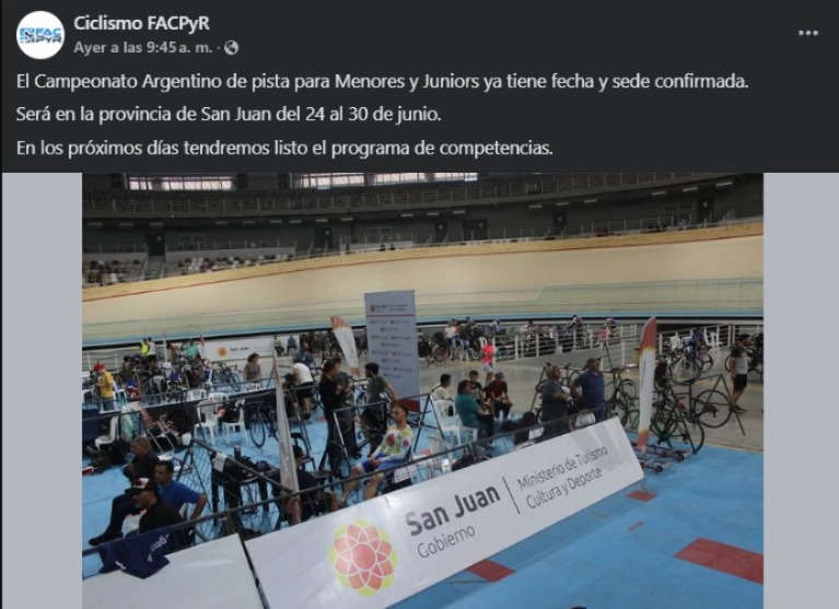 La FACPyR (Federación argentina de ciclismo de pista y ruta) lo terminó confirmando en las últimas horas, tanto en sus redes como a la organización, desde ahora se comienza con el armado de los cronogramas.