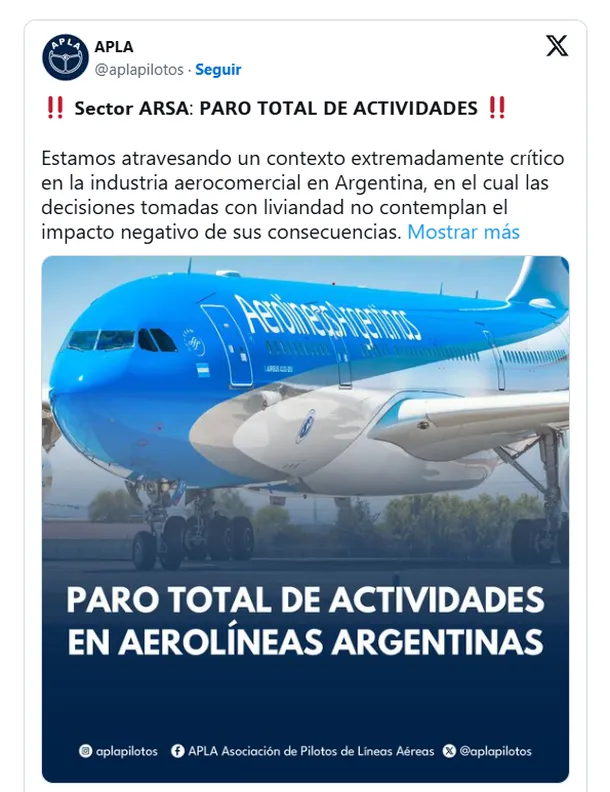 «Estamos atravesando un contexto extremadamente crítico en la industria aerocomercial en Argentina, en el cual las decisiones tomadas con liviandad no contemplan el impacto negativo de sus consecuencias», explicaron desde la entidad gremial que nuclea a los pilotos.