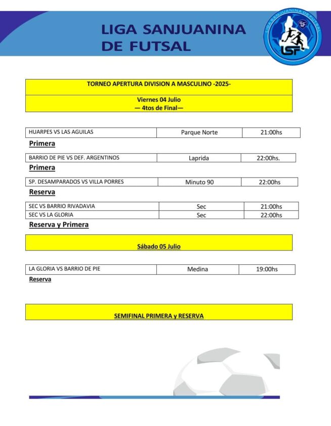 La mayoría de los deportes en la provincia están llegando a la finalización de sus primeros torneos, uno de ellos es el futsal en la rama masculina que entre en etapa de playoffs desde esta noche en la división A, en primera y reserva.