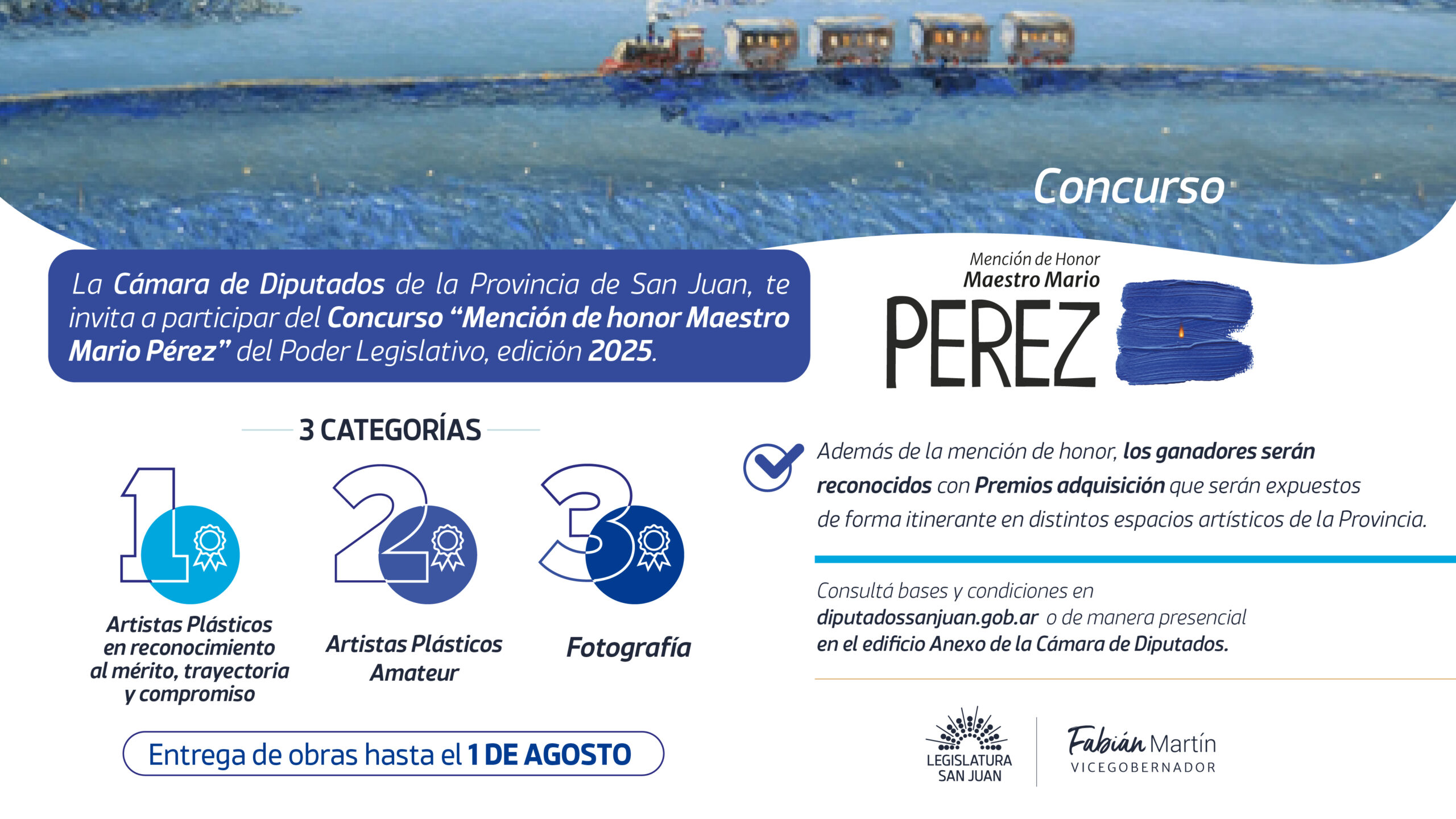 La Cámara de Diputados de San Juan recuerda que continúa abierta la convocatoria para participar en una nueva edición de la Mención de Honor Maestro Mario Pérez, una iniciativa que busca reconocer y visibilizar el talento de artistas plásticos y fotógrafos de toda la provincia. Las obras podrán presentarse hasta el 1 de agosto de 2025.