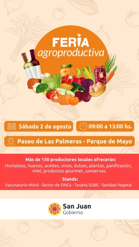 Este sábado 2 de agosto, de 9 a 13 horas, el Paseo de las Palmeras del Parque de Mayo albergará una nueva edición de la Feria Agroproductiva, la primera del mes, con la participación de 130 expositores y diversos organismos del Estado que brindarán servicios gratuitos a los visitantes.